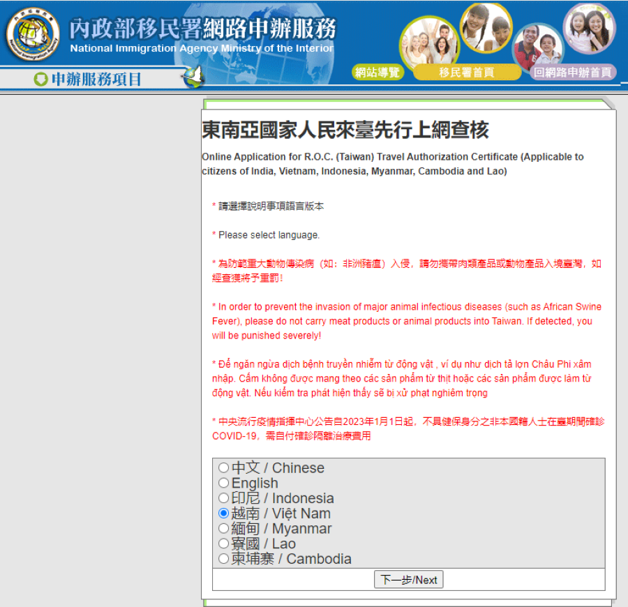 Chọn ngôn ngữ (Việt Nam), chọn “Next” ⇒ Trang kế tiếp sẽ thể hiện toàn bộ Quy trình đăng ký xét duyệt online visa Đài Loan miễn phí ⇒ Chọn “Next” để tiếp tục sang trang: Những điều cần lưu ý ⇒ Tiếp tục “Next”